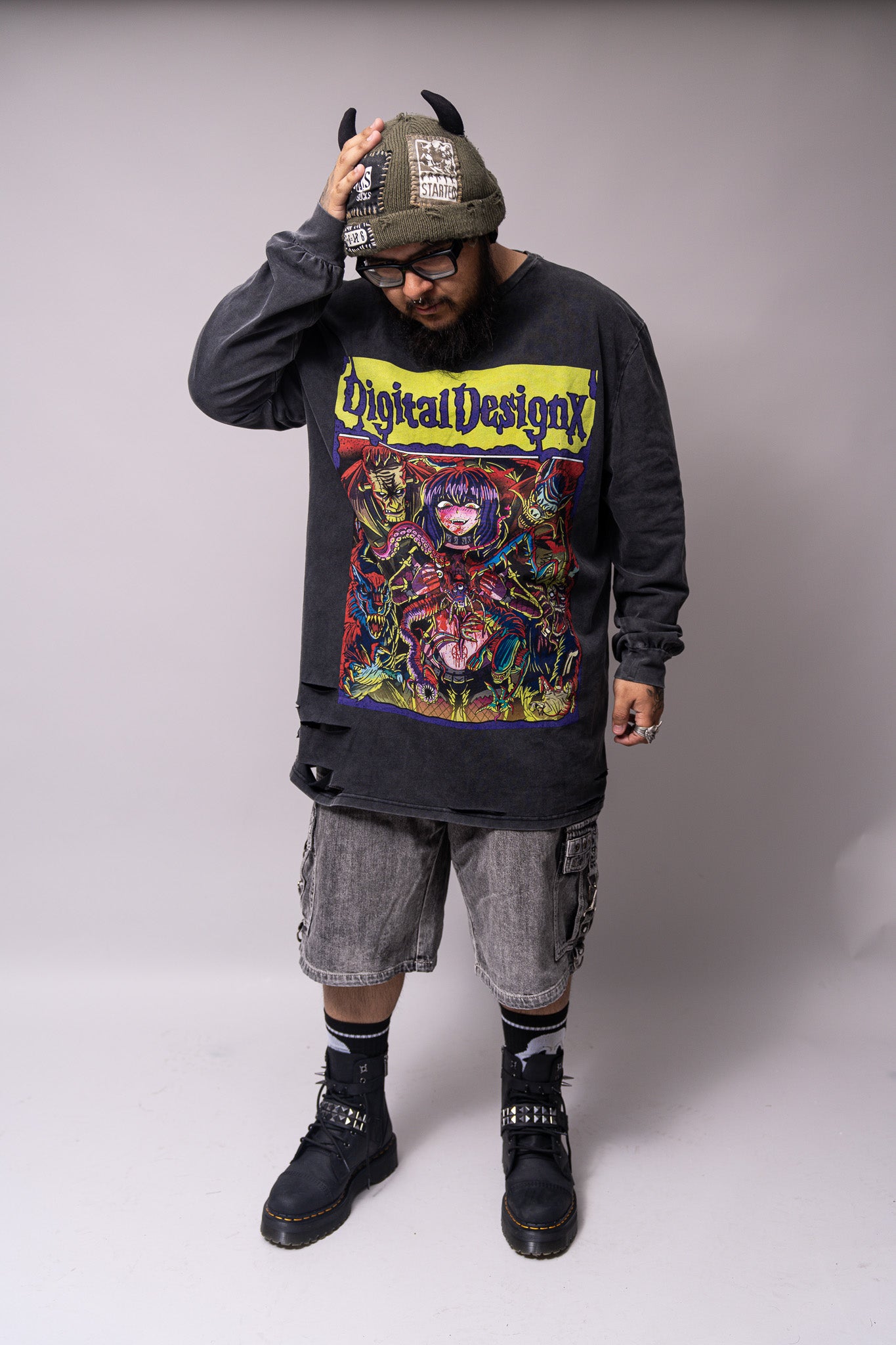 This isn’t just a shirt—it’s a statement. Our HORRORVILLE brings heavy-hitting grunge energy with bold, chaotic artwork that feels straight out of a dystopian manga panel. The oversized graphic print and distressed details give it that worn-in, underground look that belongs in the pit, on the streets, or layered up for a late-night sesh.